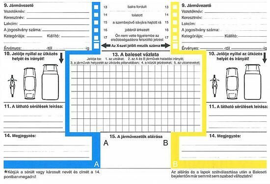 Anyagi kárral járó közúti baleset esetén nem szükséges minden esetben rendőrt hívni. Ha a felek között nincs vita a történtekről, mindkét fél elismeri a felelősségét, és nincs személyi sérülés, akkor elég a baleseti bejelentő, köznyelven a „kék-sárga” vagy betétlap nyomtatvány kitöltése, amely rögzíti a baleset helyét, idejét, a részt vevő járművek adatait, a károk leírását és a felelősség vállalását. A biztosítók ez alapján tudják majd rendezni a kártérítési ügyet. Fontos tudni, hogy bár a bejelentőlap autóban tartása ajánlott, nem kötelező – mégis, erősen javasolt mindig tartani belőle egy példányt a kesztyűtartóban. Már elektronikus formában is letölthető.