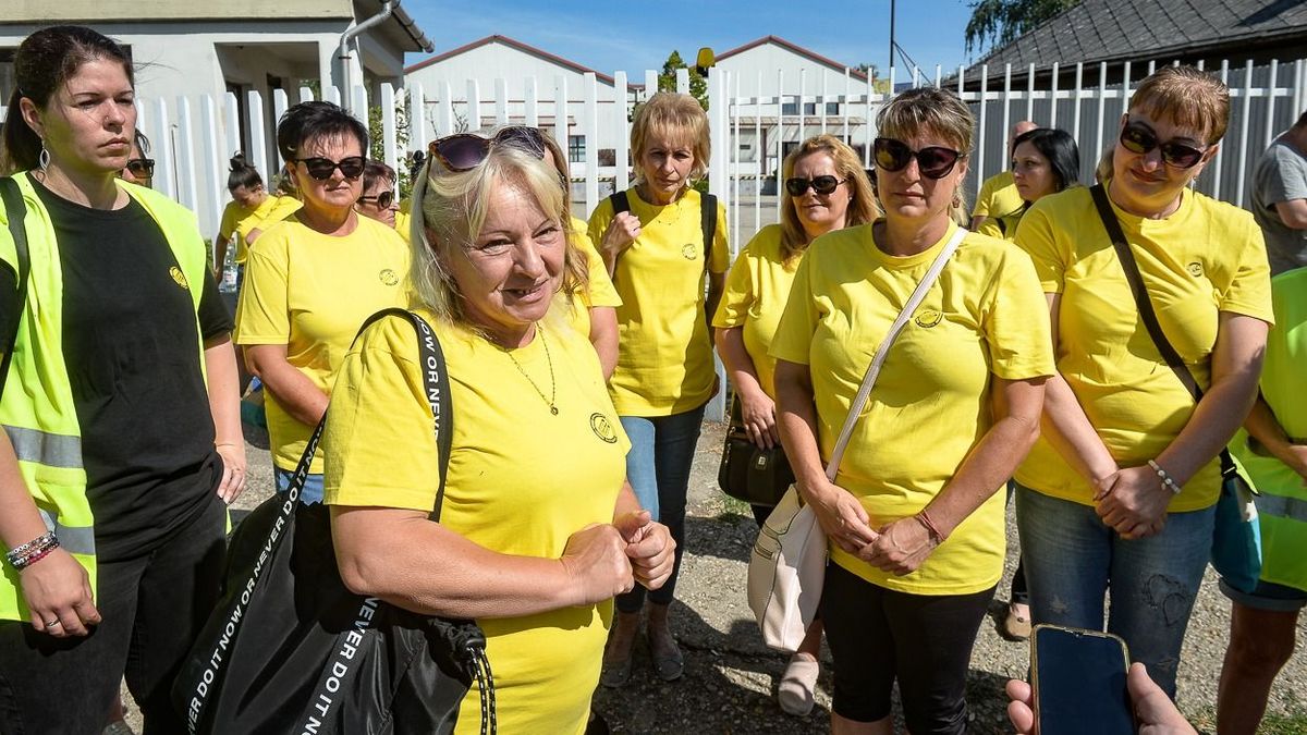 Az elbocsátott dolgozók nevében Kondásné Petrik Mónika beszélt portálunknak a gyöngyöstarjáni telephely előtti júniusi demonstráción Forrás: Czímer Tamás / Heol.hu