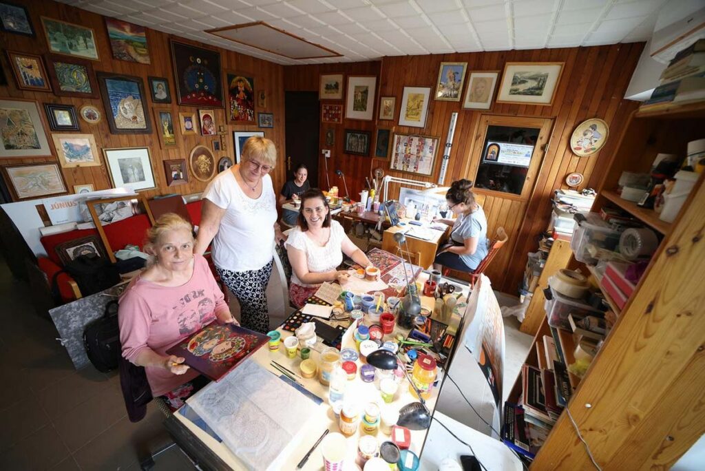 A műhelyben Adrienn nagymacskákat és portrékat alkot, Anett pedig Mohács egyik legendáját dolgozza fel. Anna madarakat, virágokat és népi motívumokat használ, míg Borbála mesés történeteket jelenít meg a képein – ő épp a képzőművészeti felvételi eredményére vár. Zsuzsa pedig természetesen idén is alkot – a témája mi más is lehetne, mint Bonyhád, a város, amelynek hírnevét a zománcművészeti alkotótábor is öregbíti.”