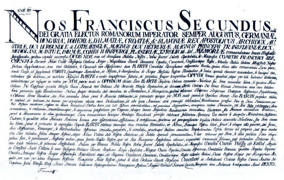 A Somogy megyében lévő BARTS birtok és a körülötte fekvő helyek fellendítése, valamint az állattenyésztés előmozdítása céljából kegyesen engedélyezzük az ott lakóknak és utódaiknak: Királyi hatalmunk teljével, különleges kegyünkből kinyilvánítjuk, hogy a nagyra tartott BARTS birtok ezentúl örök időkre az OPPIDUM (mezőváros) névnek örvendjen. Azontúl, ősi szokás szerint a kijelölt helyen évente három alkalommal szabad vásárt tartson.