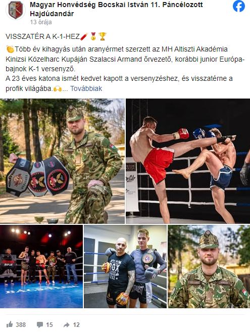 Több év kihagyás után aranyérmet szerzett az MH Altiszti Akadémia Kinizsi Közelharc Kupáján a debreceni származású Szalacsi Armand őrvezető, korábbi junior Európa-bajnok K-1 versenyző. Az MH Bocskai István 11. Páncélozott Hajdúdandár 23 éves katonája emiatt ismét kedvet kapott a versenyzéshez, és visszatérne a profik világába, melybe kamaszként csöppent bele – olvasható a mh11.honvedseg.hu hivatalos oldalán.