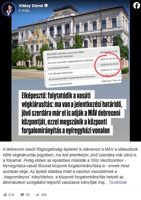 Az Építési és Közlekedési Minisztérium (ÉKM) a választások előtti végkiárusítás részeként a MÁV debreceni, a Piac utca 18. címen található vasúti főigazgatóságának épületét is pénzzé tenné: elárverezi az ingatlant, melyre itt, az elektronikus aukciós rendszerben lehet licitálni.